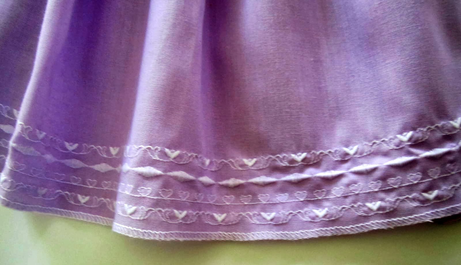 This is a pinafore that I made for my granddaughter. I wanted to see how it would look with just the hem serged and then decorative stitching on top of that. Here are the results.